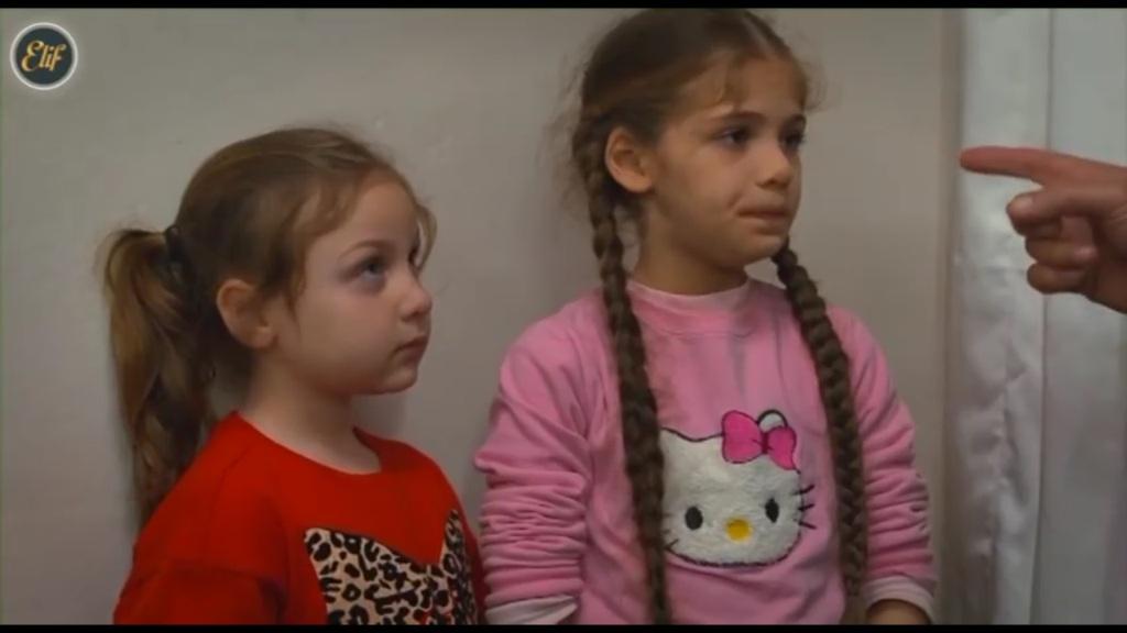 348: Cemal wchodzi do pokoju dziewczynek. „Co wy tu psocicie?” – pyta mężczyzna. „Nie, my nic…” – zapewnia Elif. „Inci, wiesz, gdzie jest cukier?”. „Nie, nie wiem…”. „Gadaj, gdzie jest?!” – powtarza mężczyzna i unosi rękę do góry… „Ja wiem, gdzie jest cukier” – odpowiada szybko Elif. „Dobrze, udajcie się teraz do kuchni i przygotujcie nam herbatę. Tylko pamiętajcie, że nie wolno wam stamtąd wychodzić! A już pod żadnym pozorem nie wolno wam wchodzić do pokoju gościnnego!”.