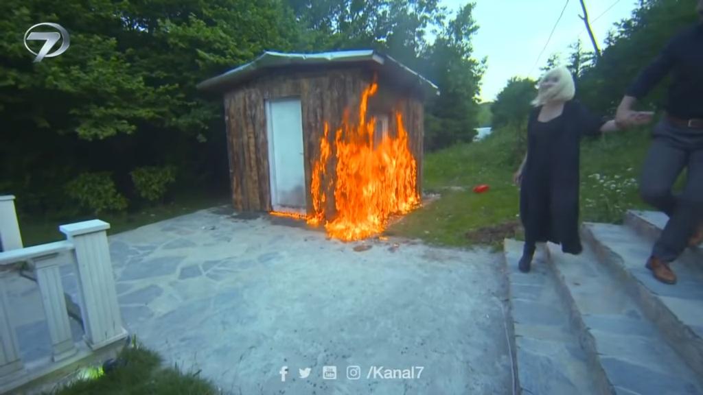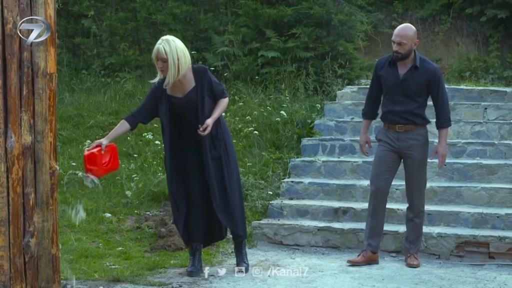 Akcja wraca na zewnątrz. Arzu wylewa całą benzynę z kanistra na chatkę. „Dość, wystarczy już. Nie mieliśmy tego w planach” – mówi Erkut. Arzu wyciąga pudełko zapałek i chce zapalić jedną z nich. Mężczyzna chwyta ją jednak za rękę i stara odwieźć od tego pomysłu. „Arzu, co ty robisz? Tego już jest za wiele” – oburza się Erkut. „Puszczaj mnie!” – rozkazuje kobieta. „Jesteś szalona. Oddaj mi te zapałki!”. „Nic już mnie nie obchodzi! Nikt nie uniknie mojej zemsty!”. Arzu pociera jedną z zapałek o draskę i rzuca ją na rozlaną benzynę. Cała chatka momentalnie staje w płomieniach. Arzu widząc to, śmieje się od ucha do ucha.