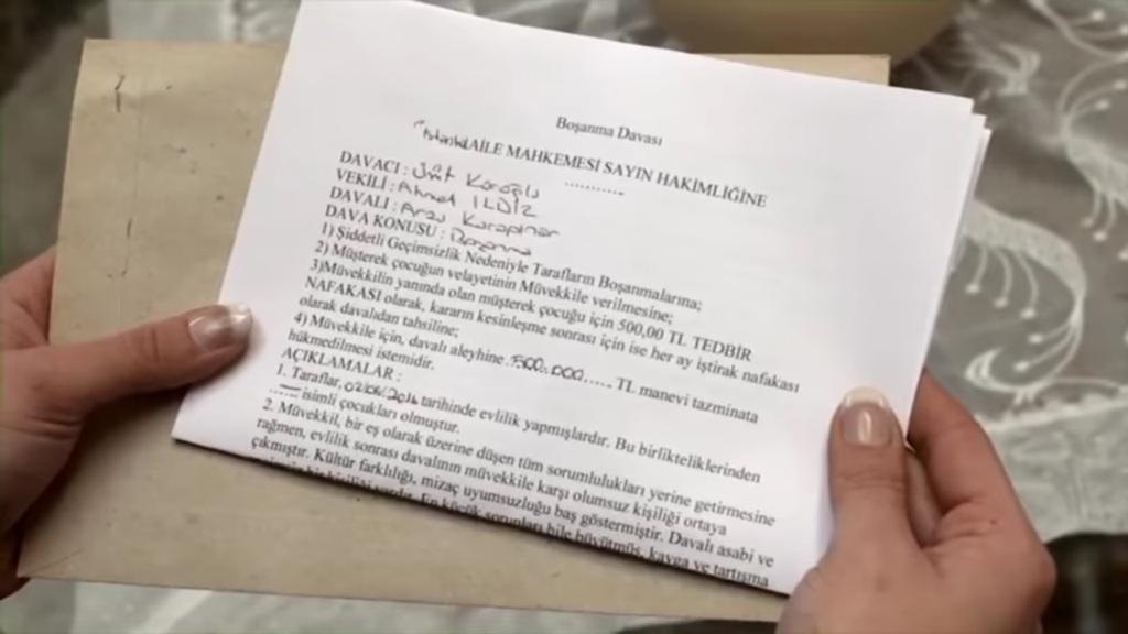 Arzu wraca do rezydencji. „Gonca! Umit!” – woła od progu, ale nikt jej nie odpowiada. – „Gdzie oni są?”. W tym momencie rozlega się dzwonek do drzwi. Karapinarówna idzie otworzyć i po drugiej stronie widzi listonosza. „Arzu Karapinar?” – pyta doręczyciel. „Aha” – potwierdza kobieta. „Mam list dla pani. Proszę tu podpisać”. Arzu potwierdza odbiór i zabiera przesyłkę. Otwiera kopertę i wyciąga ze środka… pozew rozwodowy! Akcja przenosi się do firmy Doruklar. Do gabinetu szefa wchodzi trzech policjantów. „Czy pan Erkut Sahin?” – pyta dowodzący. „To ja. O co chodzi?” – pyta mężczyzna, podnosząc się z fotela. „Mamy nakaz przeszukania tego biura. Proszę nie stawiać oporu”.