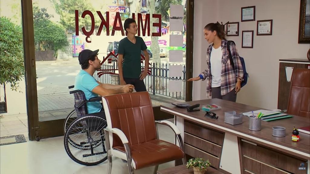 „Co powiedziałeś?!” – oburza się Sabah. Nagle do biura wchodzi kolejny klient. „Najszybciej jak to możliwe szukam domu do wynajęcia” – oznajmia interesant. „Oczywiście, proszę usiąść. Jakiego domu pan potrzebuje?”. „Koniecznie z widokiem na morze”. „Przykro mi, ale takiego domu nie mamy w ofercie” – odzywa się Kerem. – „Takich domów w Stambule jest i tak bardzo mało, więc bardzo mi przykro, ale nie możemy panu pomóc”. „Przeproszę pana na dwie minuty” – mówi Sabah, chwyta za wózek i odwozi Kerema z powrotem do domu.